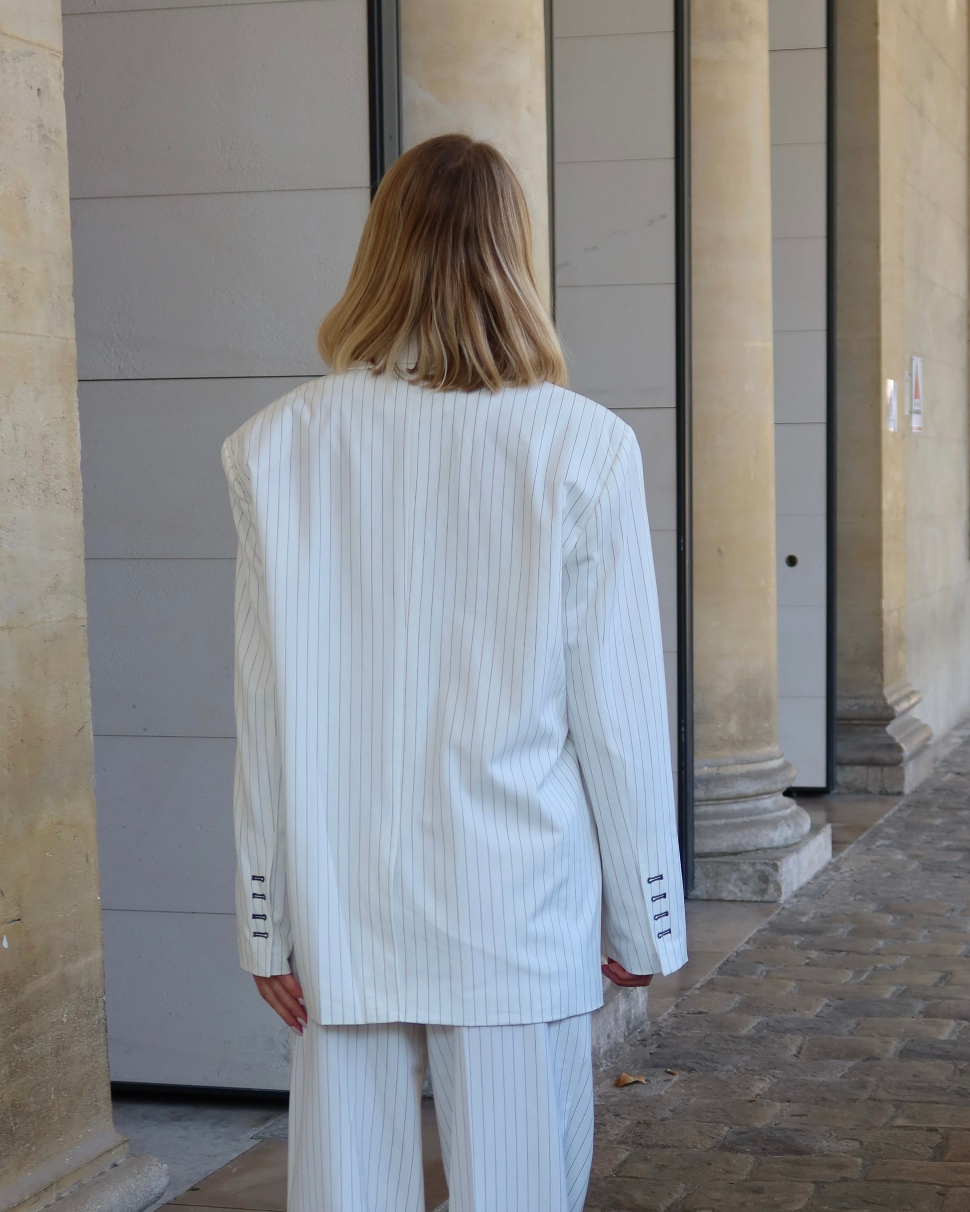 Chic et structuré, ce blazer fluide rayé crème se porte aussi bien en ensemble qu’avec un jean. Un incontournable pour un look citadin et raffiné.