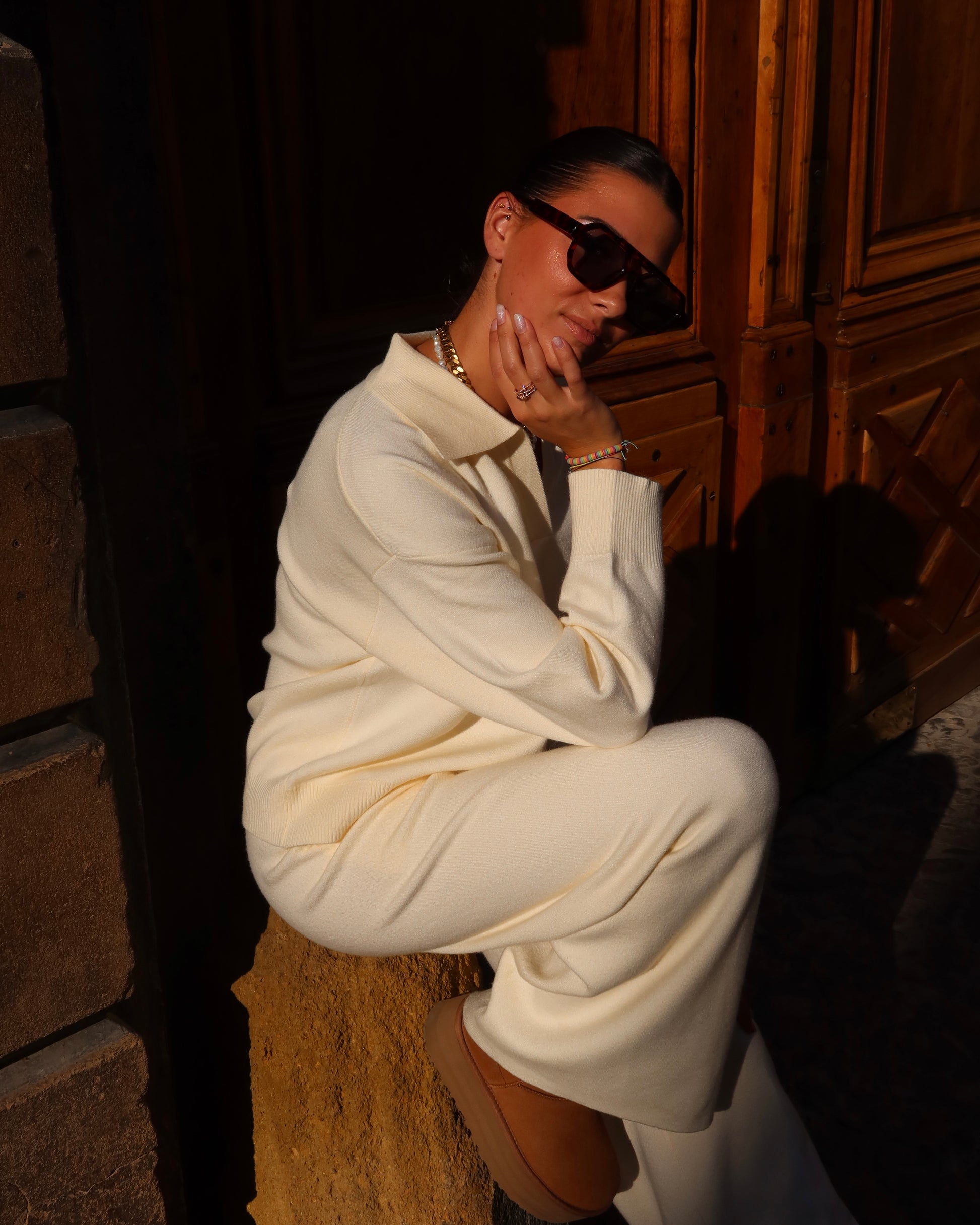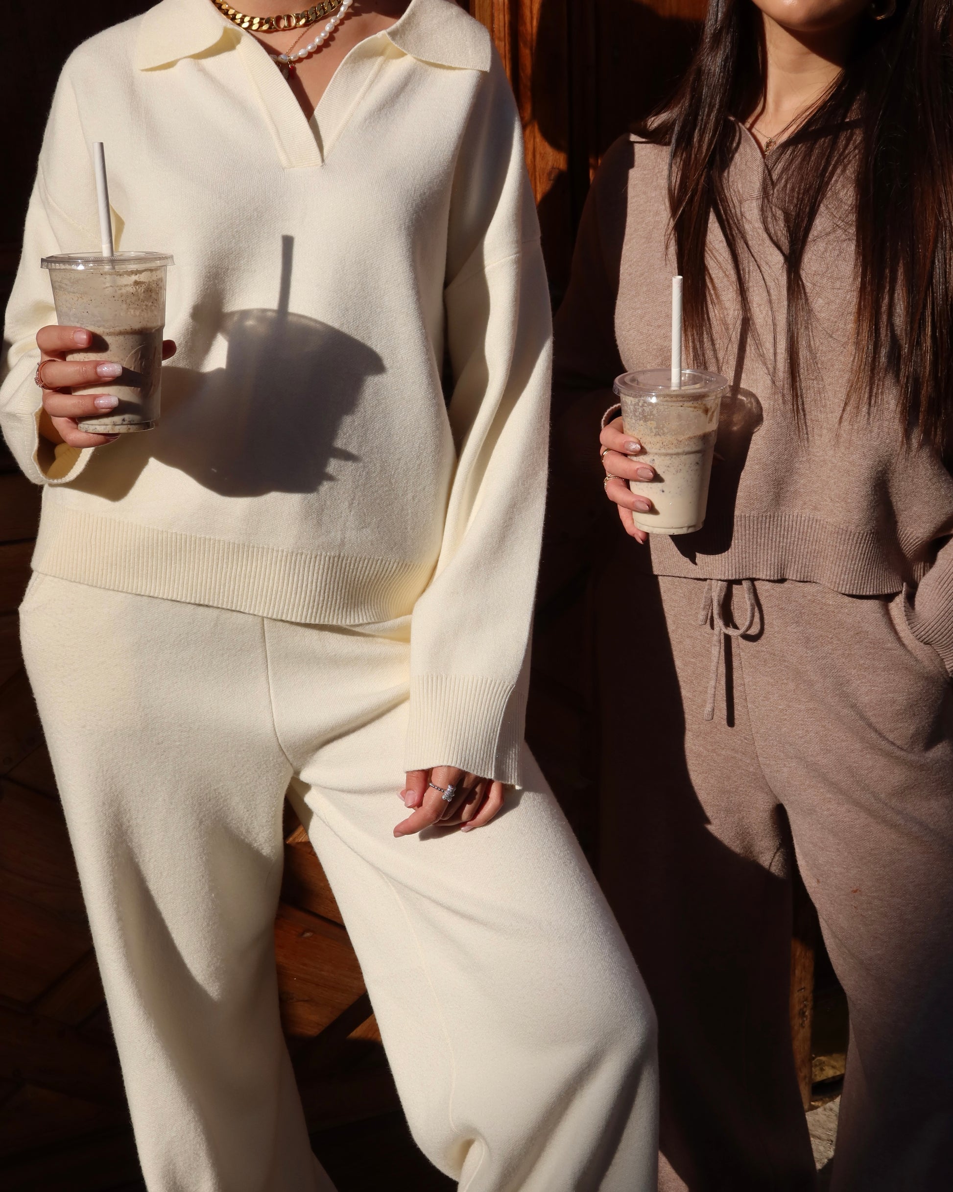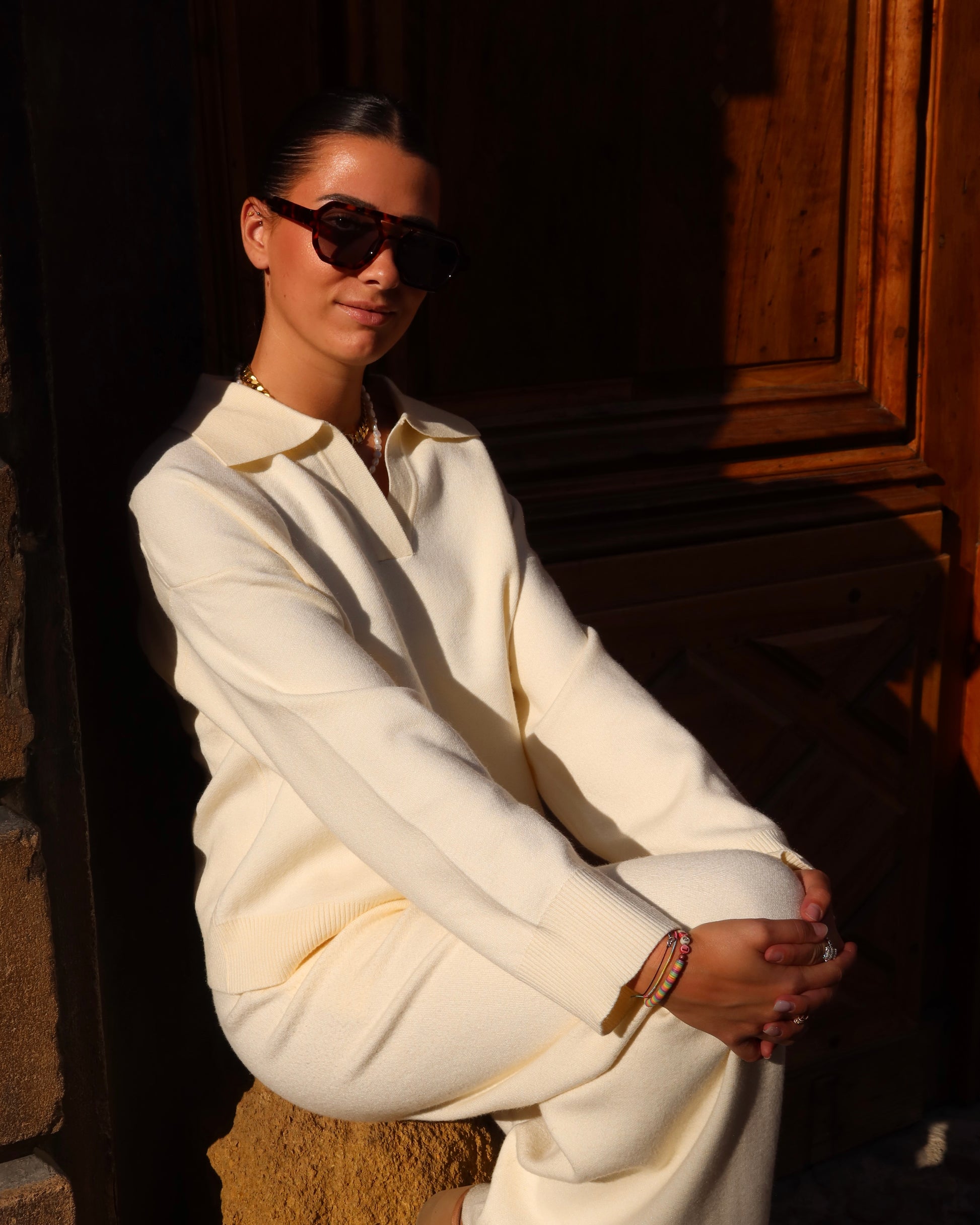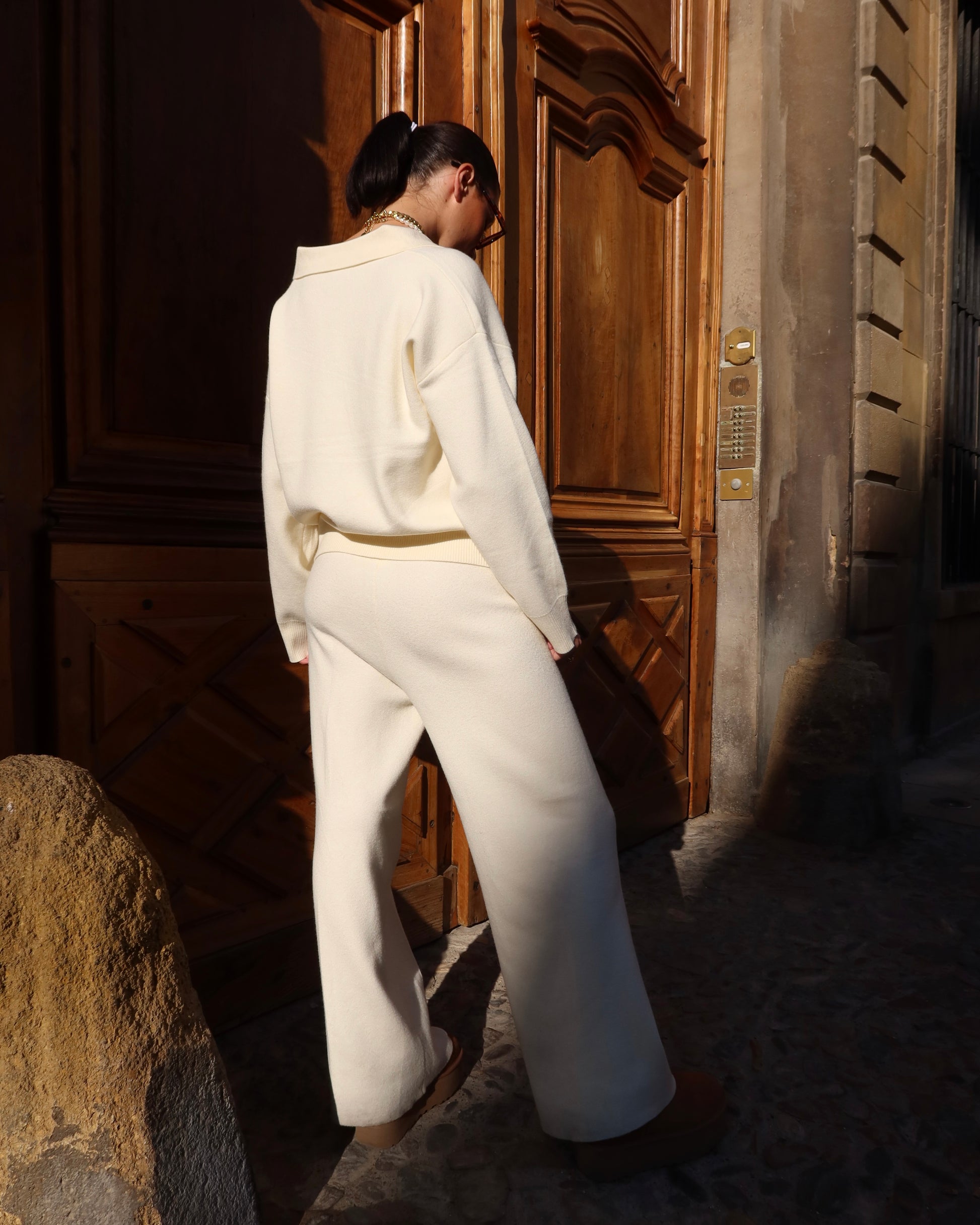 Un ensemble en maille doux et confortable. Son col ouvert et sa coupe fluide apportent une touche chic au quotidien. À porter ensemble ou séparément pour un look décontracté et raffiné.
