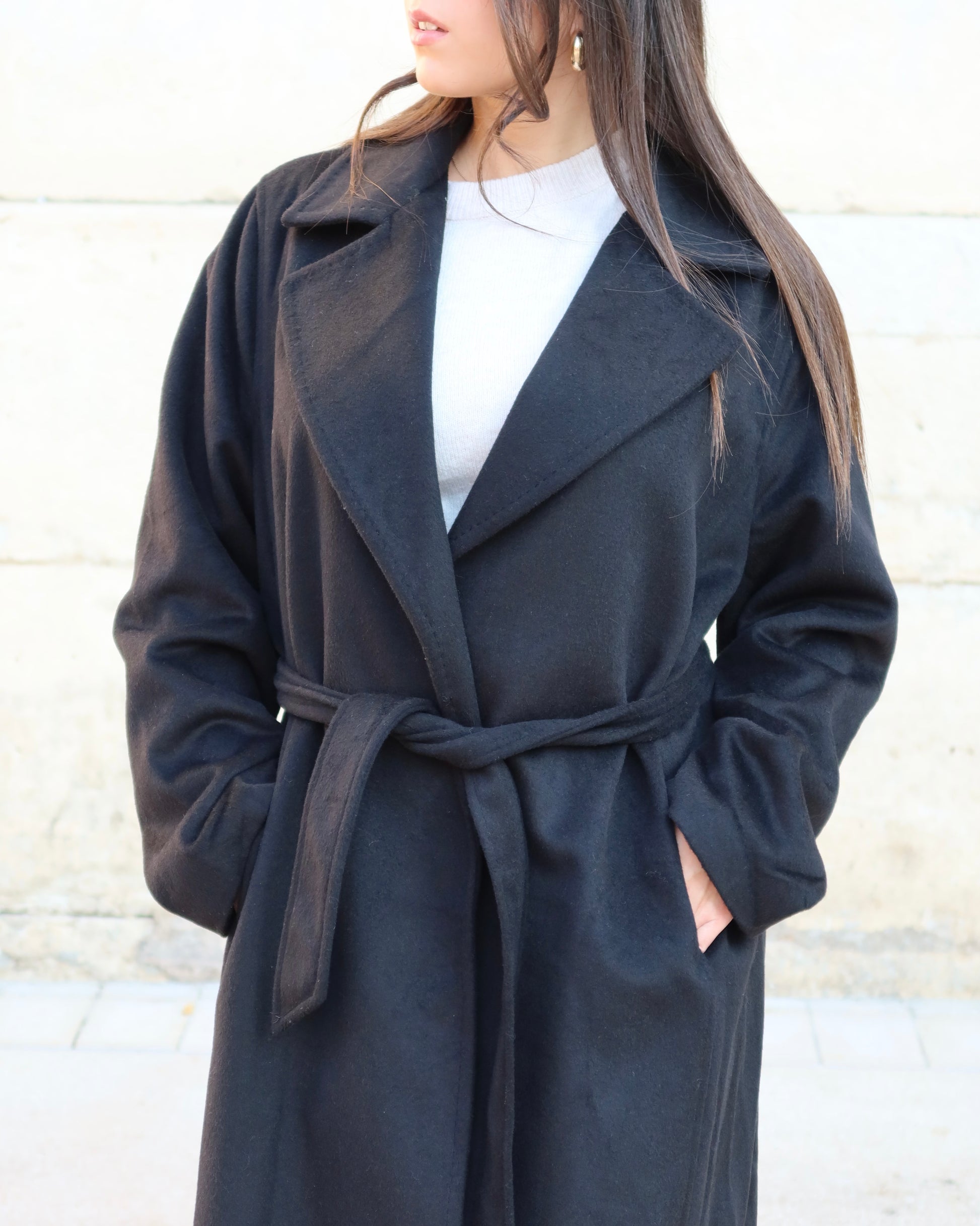 Ce manteau long fluide à ceinture souligne joliment la taille. Sa texture douce lui donnent un charme automnal et sophistiqué.