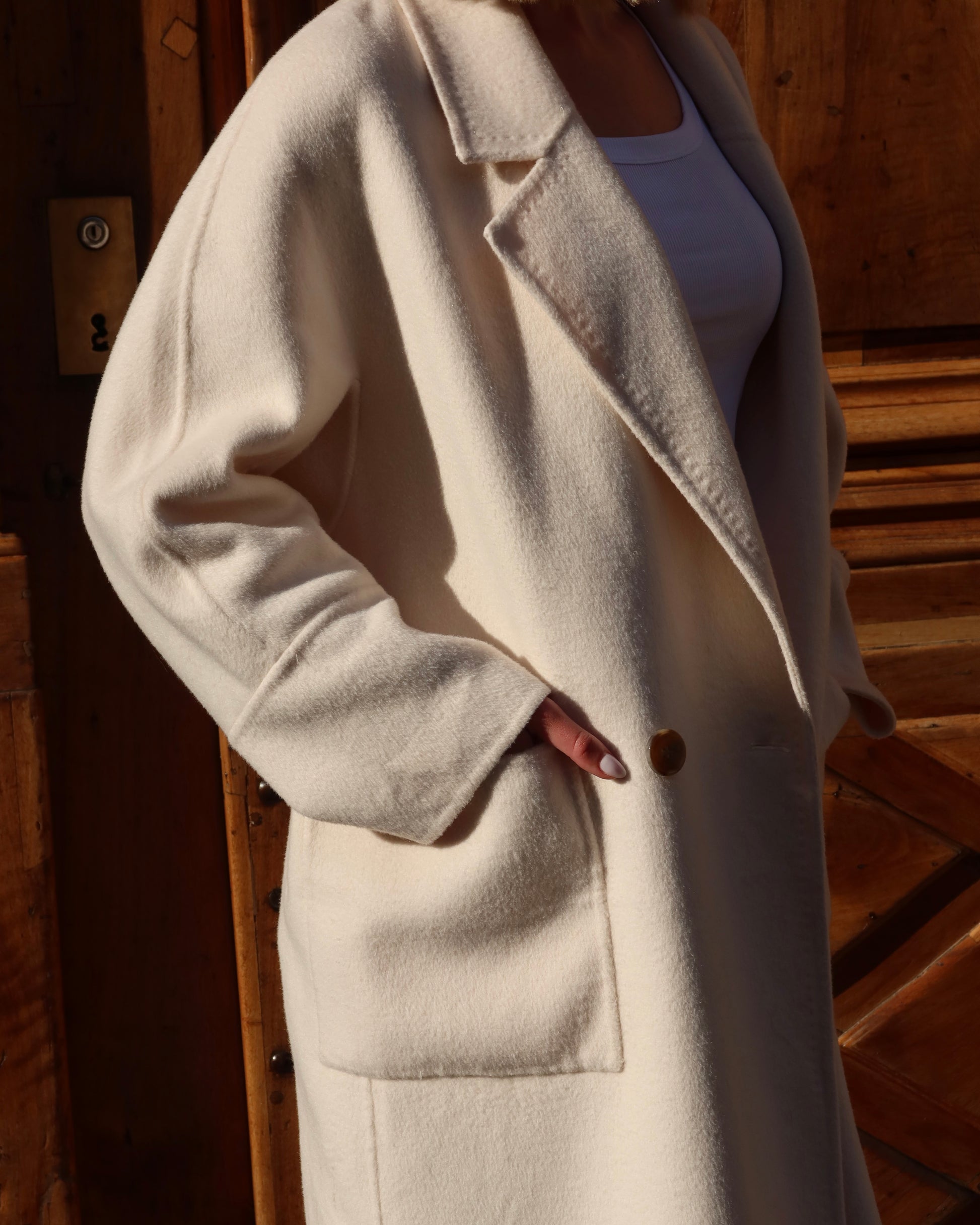 Un manteau long au tombé fluide, au style minimaliste et raffiné. Parfait pour la mi-saison, il apporte une touche lumineuse et chic à toutes les silhouettes.