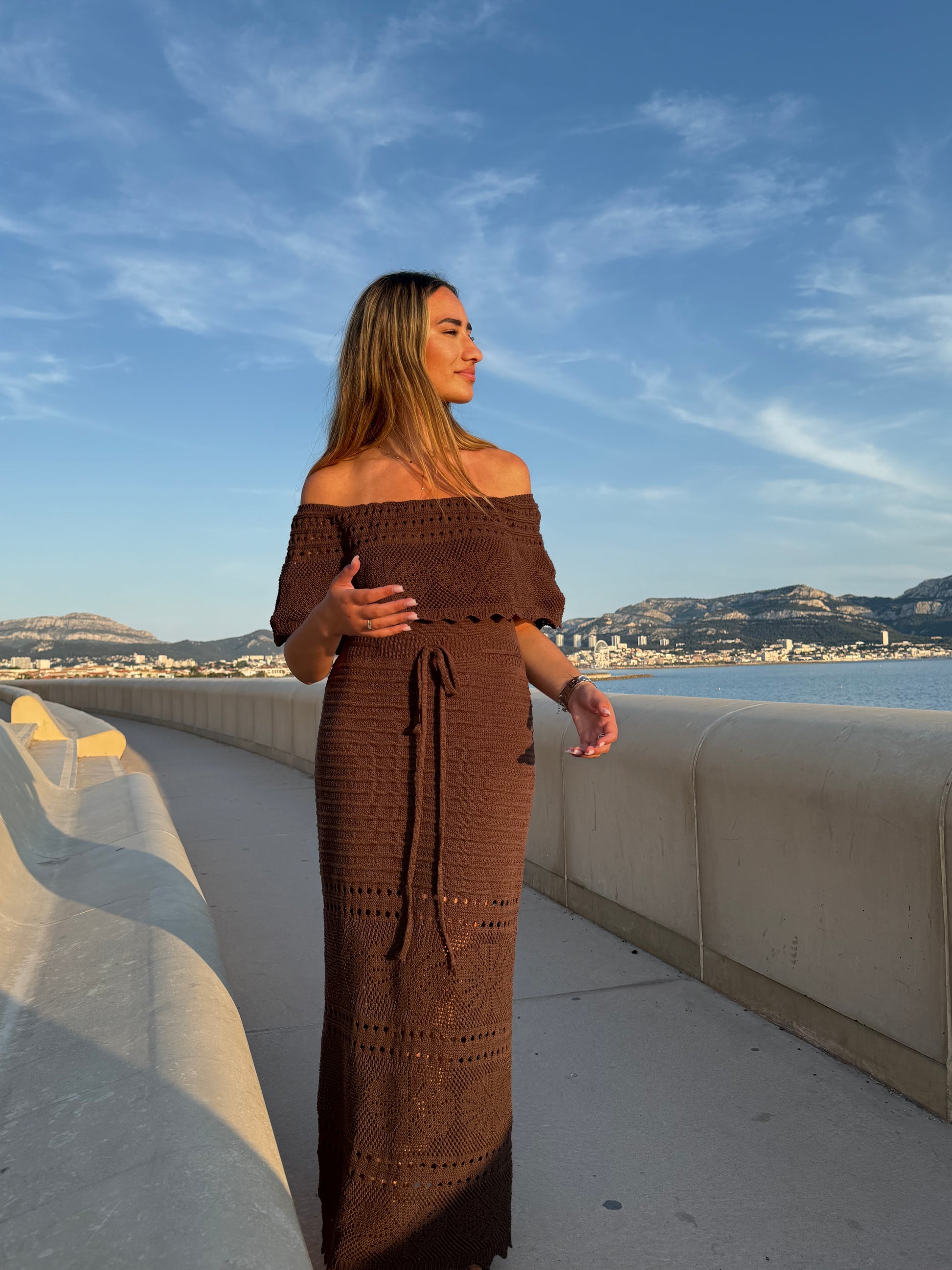 Robe en maille près du corps avec un col bateau. Douce, confortable et facile à porter.